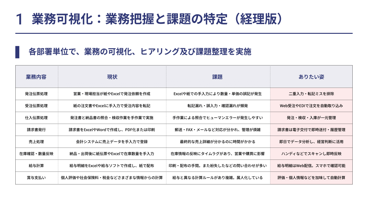 業務課題抽出、取り組み優先度選定、重要度整理などを行い、お客さまの要求事項を整理します。