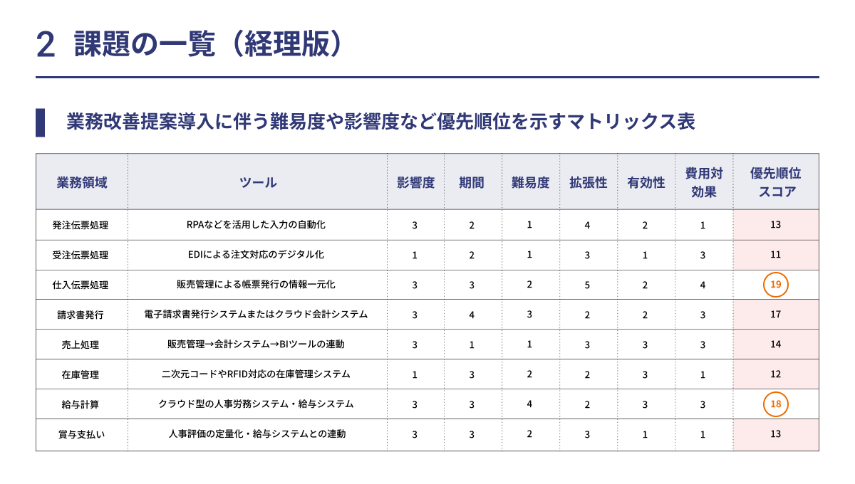 業務課題の抽出、取り組みの優先度・重要度の整理、アクションプランの具体化、ロードマップ作成